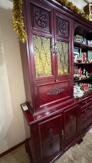 Mueble de salón de madera en color rojo, con puertas de cristal y cajones. - Diseño clásico con detalles ornamentales. - Puertas de cristal con divisiones. - Amplio espacio de almacenamiento. Recogida en Bilbao Vizcaya.