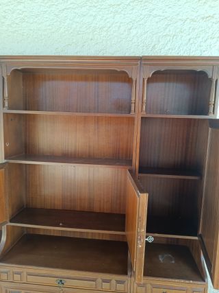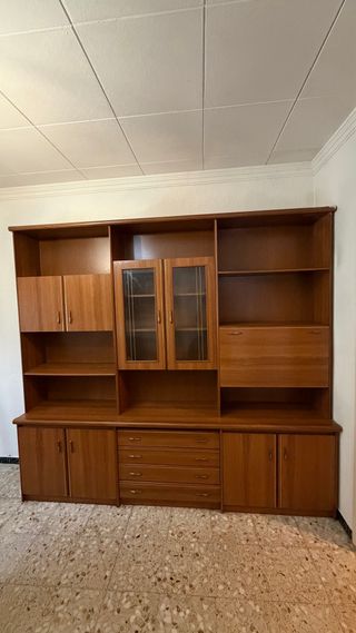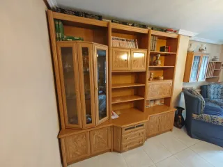 Mueble aparador / vitrina de salón en madera maciza – Estilo clásico Se vende mueble de salón de gran calidad, fabricado en madera maciza y chapada, muy robusto y elegante. Diseño clásico atemporal, ideal para comedor o salón. Dispone de: • Vitrina con puertas de cristal para vajilla o cristalería • Amplias estanterías abiertas para libros u objetos decorativos • Módulos cerrados con puertas • Cajonera central muy espaciosa • Gran capacidad de almacenaje El mueble está en muy buen estado, bien conservado y sin daños estructurales. Perfecto para quienes buscan un mueble sólido y duradero, con estilo tradicional.
