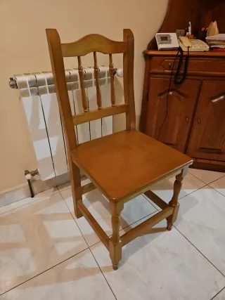 Conjunto de sillas para el salón, con un diseño clásico y elegante. - Estructura de madera resistente. - Asiento tapizado en tela. - Respaldo con listones de madera. Se vende a 9€ la unidad, tengo 6.