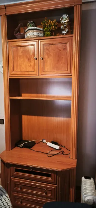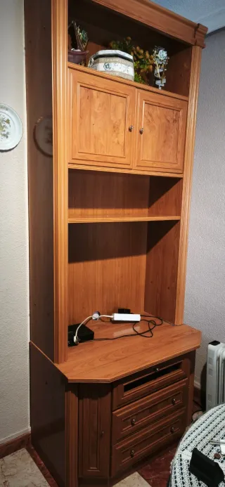 Conjunto de muebles de madera maciza, estilo clásico, ideal como despacho o zona de trabajo. Muy robustos y funcionales. Se venden juntos o por separado. 🔹 Conjunto completo: 300€ Incluye mueble escritorio para ordenador + vitrina superior. 🖥️Mueble escritorio ordenador: 160 € Con espacio para monitor, bandeja extraíble para teclado, compartimentos interiores y cajones. 🗄️ Vitrina superior: 170 € Con puertas de cristal y estantes, ideal para libros o almacenaje. Buen estado general, con signos normales de uso. 📍 Nerja. Recogida a cargo del comprador.