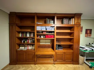 Preciosa unidad de mueble para televisor en color cerezo. Está en muy buen estado y ofrece mucho espacio de almacenaje. - Incluye estanterías, armarios y cajones. - Perfecto para organizar tu salón. - Color cerezo, estilo clásico. Las medidas del mueble son alto 2,35mts x ancho 1,93cm x fondo 0,37 en los laterales y en el.centro donde los cajones 0,56cm.