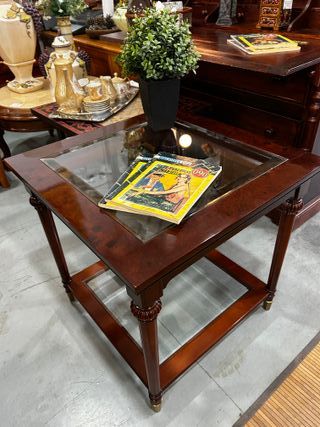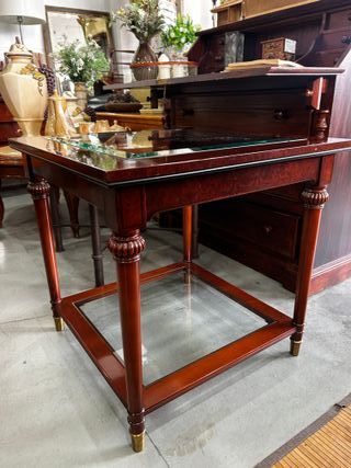 Elegancia y carácter para tu salón. Mesita auxiliar o de centro de alta calidad. Es una pieza con peso, estructura sólida y acabados de ebanistería. • Estilo: Clásico con toques Regencia o Neoclásicos. Destaca por sus patas estilizadas con detalle tallado en la parte superior (forma de anillo o bulbo) y terminaciones en latón/bronce en la base, lo que le da un aire muy sofisticado. • Materiales: Madera maciza de tono caoba/cerezo con una veta preciosa y muy bien conservada. Cuenta con dos niveles de cristal biselado, lo que permite exponer libros de arte o decoración en la parte baja sin recargar el espacio visualmente.