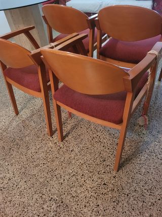 Conjunto de cuatro sillas para comedor o salón. Son de madera y tienen asientos de tela color rojo. Se encuentran en buen estado, listas para usar. - Asientos tapizados. - Estructura de madera robusta. - Diseño clásico y elegante. Altura asiento 44 cm Altura total silla 78cm Fondo asiento 48 cm Ancho asiento 52 cm. Recogida en persona. Cerezo haya nogal Charles Eames Chair Sofá Comedor