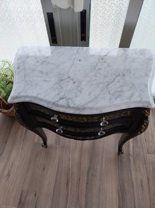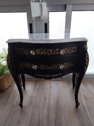 Elegante mesita de noche con dos cajones. La tapa es de mármol blanco veteado y la estructura está pintada de negro. Tiene un diseño curvado y patas torneadas. - Estilo clásico y elegante. - Perfecta para dormitorio o recibidor. - Dos cajones con pomos de cristal.