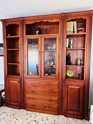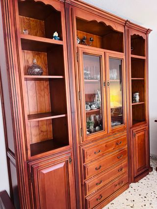 Se vende mueble completo de salón en excelente estado, fabricado en madera maciza con acabado clásico. Cuenta con múltiples compartimentos: vitrinas con puertas de cristal, cajones espaciosos y armarios con gran capacidad de almacenamiento. Incluye espacio central para colocar televisión. Medidas aproximadas: Alto 2'50 m Ancho 3'00 m Fondo 45 cm Ideal para salones amplios. Muy cuidado, sin daños importantes. Se vende por reforma en vivienda. A recoger en domicilio a cargo del comprador
