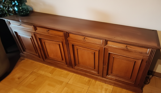 Aparador de madera maciza estilo clásico Mueble de alta calidad con herrajes de latón y detalles tallados. En muy buen estado general, con leves marcas de uso. Ideal para salón o comedor o mueble tv. - Cuatro cajones amplios. - Dos puertas con tiradores ornamentados. - Acabado en tono madera oscura (creo que nogal)