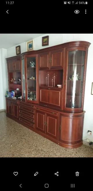 Mueble de salón de madera oscura, con vitrina central y múltiples compartimentos. - Diseño clásico y elegante. - Vitrina central con puertas de cristal. - Amplio espacio de almacenamiento. - Acabado en madera oscura. Usado, urge vender por mudanza, primera planta con ascensor. Cerca de Finestrellas