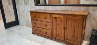 Mueble de interior con un diseño clásico y funcional. Tiene bastante uso y algunos golpes/ desperfectos. El precio es para la compra de todas las piezas. Aquí la descripción por unidad y precio unitario: Cajonera con tirador: dos cajones más armario con puertas. 80x70x30. 20euros Cajonera: 3 cajones. 60x80x40. 15euros Cajonera: 4 cajones. 70x80x40. 15euros Mesa baja: 50x100x50. 10euros Mesitas de noche (3 unidades): 60x45x35. 5euros/unidad Se puede visitar sin compromiso.