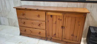 Mueble de comedor de madera de pino macizo. Un mueble robusto y espacioso, perfecto para organizar tu vajilla y otros objetos. - Diseño clásico y elegante. - Amplios compartimentos con puertas y cajones. - Acabado natural de la madera.