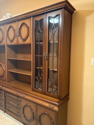 Oportunidad. Vendemos el piso y tenemos este precioso mueble clásico de ebanista estilo boiserie. - Diseño clásico en madera de nogal - Combinación de espacios cerrados y vitrinas. - Ideal para exhibir tu vajilla o libros. Cajón para ocultar TV . Es un mueble precioso . Se puede ver antes de comprar . Escucho ofertas razonables .