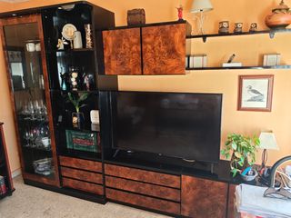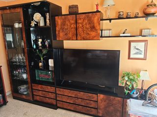 Mueble de salón de estilo clásico en excelente estado Se vende elegante mueble de salón de madera chapada en tonos caoba, con un diseño clásico y muy cuidado. Cuenta con varias vitrinas laterales curvas, estantes amplios, dos puertas abatibles decorativas y módulo inferior con cajones, ideal para almacenamiento. El mueble está bien conservado, con detalles decorativos y un acabado brillante que aporta calidez y presencia a cualquier salón. Perfecto para quienes buscan un mueble resistente, espacioso y con un estilo atemporal.