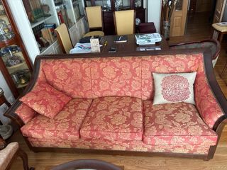 Sofá tapizado floral rojo y madera