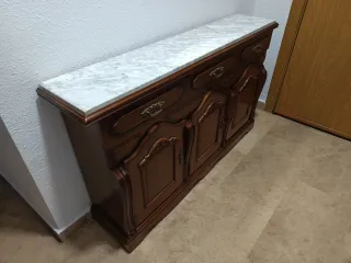 Elegante mueble de madera con una superficie de mármol. - Diseño clásico con detalles ornamentales. - Combinación de colores marrón y blanco.