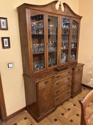 Elegante mueble de madera maciza (4cm) de nogal boiserie de alta calidad, perfecto para almacenar y exhibir objetos. - Diseño clásico con puertas de cristal y compartimentos. - Acabado madera e incrustaciones de madera Muy buenos acabados. Madera maciza todo el mueble, lo que consigue que sea un mueble difícil de encontrar por su calidad en la madera. No se envía, solo recogida, pero se ayuda en el desmontaje. Se aceptan ofertas.
