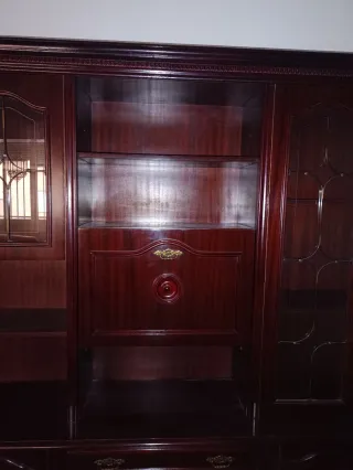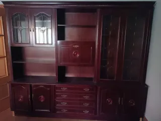 Vendo mueble de salón completo de madera oscura, diseño clásico con detalles ornamentales. Fabricado en madera de cerezo, muy resistente y en excelente estado. Incluye vitrinas y múltiples compartimentos con gran capacidad de almacenaje. Medidas: Altura: 210 cm Largo: 275 cm Ancho: 45 cm Ideal para salones amplios y decoración clásica. Recoge en mi domicilio, Requiere transporte propio y ayuda para moverlo.