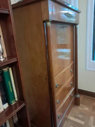 Precioso mueble de salón de estilo antiguo, ideal para darle un toque clásico y elegante a tu hogar. Se vende por traslado. - Mueble de madera oscura con detalles en marquetería. - Dispone de cajones y compartimentos para almacenamiento. - Perfecto estado de conservación. Estilo budmayer