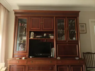 NEGOCIABLE Mueble de salón de madera maciza con un diseño clásico y elegante. Perfecto para dar un toque de distinción a tu hogar. - Acabado en madera de tono marrón. - Puertas y cajones con tiradores dorados. - Estanterías interiores para almacenamiento. - Frontales de cristal en algunas secciones. No dudes en contactar conmigo para cualquier duda. Imprescindible venir a recogerlo y desmontarlo. No se aporta mano de obra, transporte ni envío.