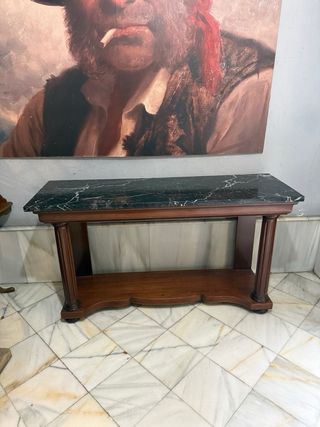 En venta elegante mueble recibidor/consola de alta calidad en perfecto estado. Una pieza robusta, atemporal y con acabados de lujo, ideal para entradas, salones o despachos con clase. Características principales: • Encimera: Mármol negro veteado auténtico con un grosor excepcional de 3 cm. • Estructura: Madera maciza en tono cálido con detalles de columnas estriadas. • Estado: Impecable, muy bien cuidada. • Medidas: 157 cm (largo) x 51 cm (fondo) x 87 cm (alto). Es un mueble muy pesado debido a la calidad del mármol y la madera, lo que garantiza su estabilidad y durabilidad para toda la vida. 📍 Ubicación: Sevilla Centro.