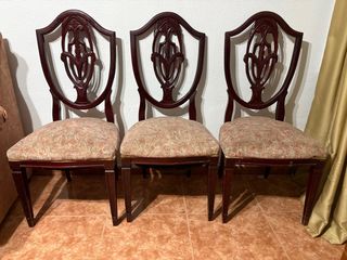 Conjunto de tres sillas de madera con un diseño clásico y elegante. Perfectas para dar un toque distinguido a tu comedor o salón. - Tapicería de tela con estampado floral. - Respaldo curvo con detalles tallados. - Patas robustas de madera oscura.