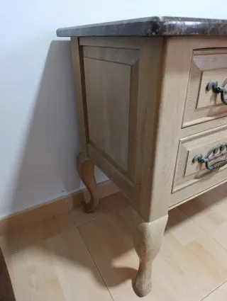 Elegante mueble de madera maciza con tapa de mármol, ideal para recibidores o salones. - Diseño clásico con patas curvas. - Dos cajones con tiradores ornamentales.