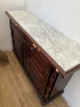 Elegante mueble de madera con una superficie de mármol. - Diseño clásico con detalles tallados. - Tiradores ornamentales. - Patas bajas con forma. - Acabado en tono madera oscuro. Lo que tiene desgaste es el frontal. Medidas en fotos