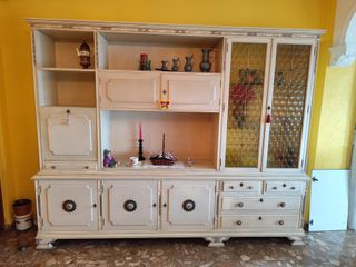 Conjunto de mueble provenzal de madera maciza, ideal para salón o comedor. - Acabado en madera de pino - Diseño clásico con puertas y cajones. - Vitrinas superiores con cristal. -Acuario no incluido. -Transporte y desmontaje a cargo del comprador. -Precio poco negociable.