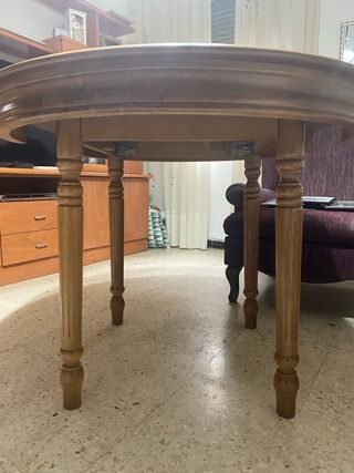 Mesa de salón de madera con un diseño clásico y elegante. - Patas torneadas con detalle. - Borde superior curvo.