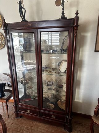 Mueble de salón con un diseño clásico y elegante. - Acabado en madera oscura. - Puertas con detalles ornamentales. - Estantes interiores para almacenamiento. - Parte superior con vitrina de cristal. Precio a convenir