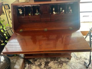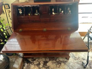 Mueble secreter de madera, ideal para salones o recibidores. Su diseño clásico aporta elegancia a cualquier espacio. - Acabado en tono marrón oscuro. - Compartimentos interiores para organización. - Cajones con tiradores. - Superficie amplia para escritura o decoración.