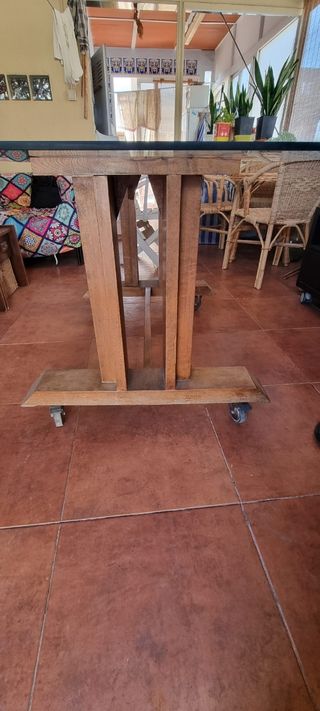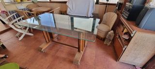 Mesa de salón rústica de cristal y patas de madera de 1'50x83 y más de 1cm de grosor del cristal precio negociable