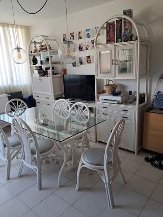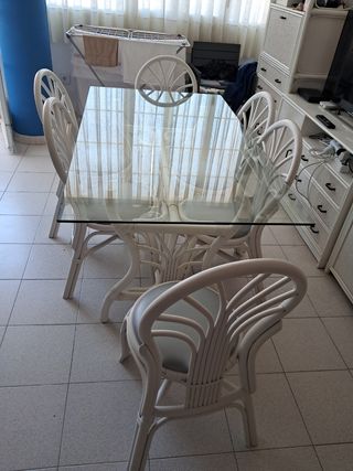 Conjunto de muebles de comedor en mimbre blanco, en buen estado. Incluye una mesa con sobre de cristal y seis sillas con asientos acolchados con Skay de alta calidad - Mesa de cristal con estructura de mimbre. - Seis sillas de mimbre con asientos grises. - Estilo clásico y elegante. - Perfecto para darle un toque rústico a tu hogar. Te lo transporto u monto en tu casa si estas en provincia de Tarragona o Barcelona Fusteria Buscá Tambien puedo hacerte la venta por separado La mesa y las 6 sillas 500€ Los 3 modulos. 400€