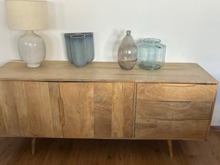 Mueble de madera con un diseño rústico y moderno, perfecto para tu comedor o salón. - Acabado en tonos marrones y multicolor. - Patas de madera inclinadas para un estilo nórdico. - Compartimento abierto con estantes. - Puertas con tirador integrado. Las medidas son aproximadas. Lo vendo de manera urgente por mudanza. Se vende en persona y se debe venir a buscar. La zona es Barcelona centro.
