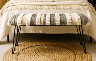 Banqueta decorativa de estilo boho chic en tonos neutros, perfecta para dar un toque cálido y acogedor al dormitorio o al salón. Queda preciosa colocada a los pies de la cama, en un recibidor o como reposapiés. Su diseño con patas negras metálicas y asiento textil con textura la convierte en una pieza muy especial que encaja en decoraciones naturales, nórdicas y bohemias. Es más que un banco: es un elemento decorativo que transforma el espacio. Estado: Muy buen estado Medidas: (añadir) ✨ Ideal para hogares con estilo natural, boho, nórdico o rústico.