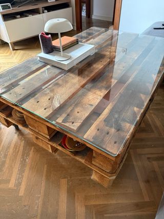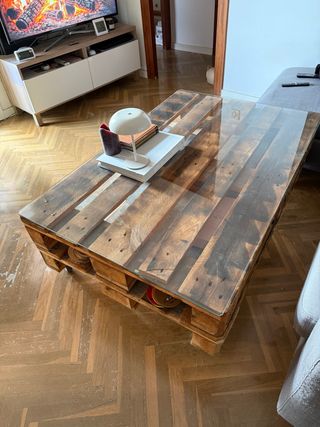 Mesa de centro con un diseño industrial y moderno, perfecta para dar un toque único a tu salón. Su estructura de palets le confiere un carácter rústico y a la vez contemporáneo. Medidas: 120 cms de largo, 81 cms de ancho y 44 cms de alto. Incluye ruedas (4) y cristal - Acabado en madera oscura. - Superficie de cristal transparente.
