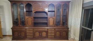 Mueble de salón de madera con vitrinas de cristal.Esta montado hay que desmontar para llevar. - Diseño elegante y funcional. - Amplio espacio de almacenamiento. - Acabado en tono marrón oscuro. Los libros también van juntos Hay dos lámparas de pared de bronce. Y uno mueble de cristal del Hall de entrada.
