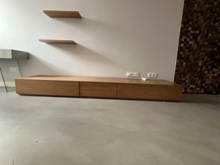Mueble de tv de nogal macizo . medidas 258x60x27. En buen estado de conservacion , aunque tiene algun arañazo y desconchon en la esquina por el uso , facilmente reparable . incluye las dos baldas de 60 cm . No lo desmonto ni mando . hay que venir a recogerlo . tiene mesita de centro a juego
