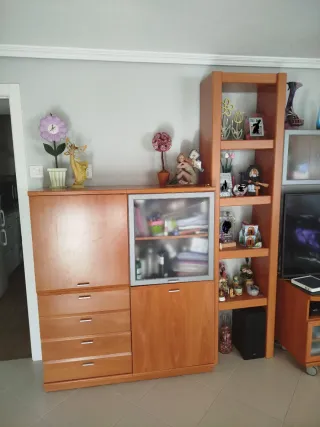 URGE VENTA! !Recogida a cargo del comprador,se recoge fácilmente,está en una planta baja a pie de calle sin escaleras. Mueble de salón modular en color cerezo, estructura firme y bien conservada, combina módulos de almacenaje y vitrina, los módulos se pueden usar también por separado, el de la tele tiene ruedas y se puede mover. Se vende por cambio de mobiliario. PARA RECOGER A MEDIADOS DE MARZO o un poco antes, aproximadamente . Cualquier duda preguntar. La mesa de la TV mide de fondo en su parte más ancha 50cm el resto del mueble máximo 39cm de fondo. El largo total del mueble completo son 3'53 metros. - Estructura de madera. - Pu