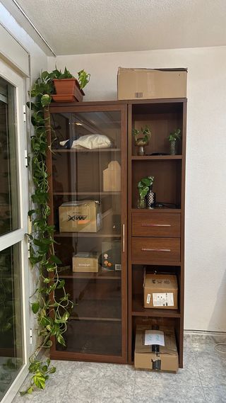 Mueble de salón: - Acabado en madera oscura. - Puertas de cristal con detalles dorados. - Compartimentos de almacenamiento variados. Interesados en comprarlo tienen que desmontarlo y llevarselo ellos, precio algo negociable