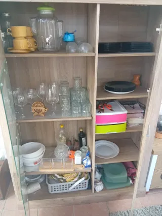 En mi perfil están los anuncios por separado para ver más fotos, medidas y descripción completa de cada mueble. Todo los muebles por 200€: -Mueble de TV más 2 muebles (uno abajo y otro arriba cogado) más una estantería. - 2 mesas de centro (una pequeña y otra grande) - Mesa ikea extensible con 6 sillas - 2 Aparadores A recoger en Plaza América, Alicante