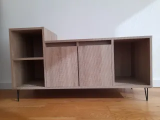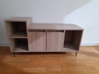 Mueble de televisión con un diseño moderno y funcional. - Acabado superior y lateral en madera. - Paneles frontales en blanco. Precio nuevo en Ikea: 215€