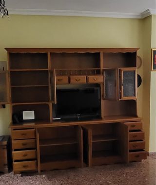 ¡MIRA MI PERFIL! Vendo el salón completo Elegante composición de salón en chapa de madera de alta calidad. Diseño robusto, funcional y en perfecto estado. El mueble es totalmente modular (4 piezas independientes), lo que permite adaptarlo a cualquier espacio. VITRINA ALTA: Estantería superior, dos amplios armarios con frontal de cristal negro ahumado y cajonera inferior. 1,90x1,15x0,50 m MÓDULO TV: Base sólida y estilizada para televisión de gran formato. MÓDULO 1: Unidad de almacenamiento con puerta batiente superior y tres cajones. 1,50x0,45x1 m MÓDULO 2: Vitrina de cristal negro con armario inferior a juego. 1,50x0,45x1 m