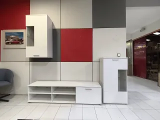 Mueble de salón modular de diseño moderno. Ideal para organizar tu espacio. - Acabado en blanco y gris marrón. . - Estructura robusta. - Múltiples compartimentos de almacenamiento. Medidas totales: Anchura: 275 cm Altura: 201 cm Profundidad: 43 cm Estado: Muy buen estado, bien cuidado. ⚠️ NOTA: El precio es exclusivamente por el mobiliario. La televisión, el calefactor y demás objetos electrónicos NO están incluidos.