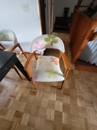 Conjunto de sillas para el salón con un diseño floral. - Patas de madera. - Tapicería de tela con estampado de flores en tonos verdes y rosas. El precio es x cada silla