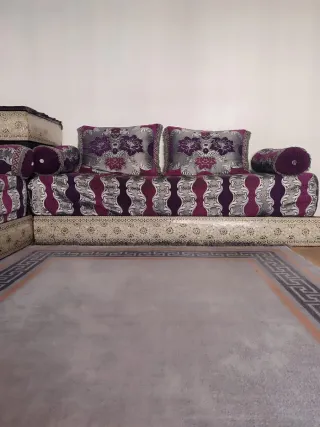 Conjunto de salón de estilo marroquí, ideal para crear un ambiente acogedor. - Tapicería con detalles en dorado y morado. - Estructura de madera. - Cojines decorativos incluidos.