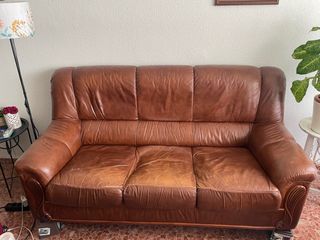 Conjunto de muebles de salón, compuesto por un sofá de tres plazas y dos sillones individuales. Todo en buen estado excepto uno de los sillones individuales que tiene una pequeña rotura en el reposabrazos derecho. Solo recogida en Córdoba en un segundo sin ascensor. Se aceptan ventas individuales. - Tapicería de piel. - Diseño clásico y elegante. - Color marrón.