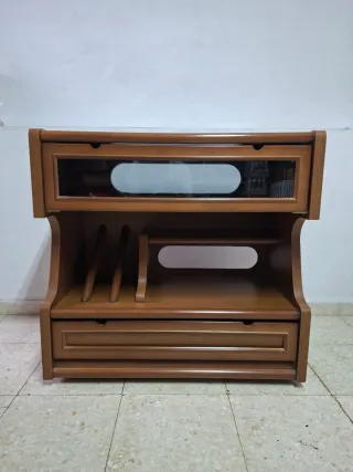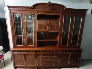 Mueble de salón estilo clásico, en madera maciza color nogal, en muy buen estado. Cuenta con: - Vitrina con puertas de cristal decorado - Amplias estanterías - Módulos cerrados - Cajonera central de gran capacidad - Tiradores metálicos decorativos Es un mueble robusto, elegante y muy funcional, ideal para salón o comedor. Perfecto para almacenar vajilla, cristalería, libros o decoración. Retirada a cargo del comprador