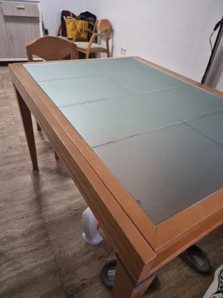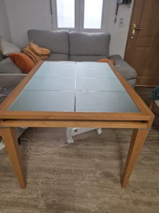 Conjunto de mesa de salón con sillas. - Mesa con sobre de cristal. - Estructura de madera.