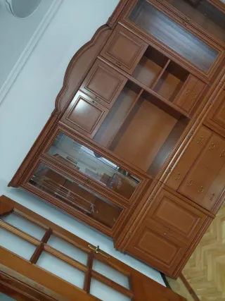 Atención, el día 17 se desmontará y se llevará fuera de Salamanca. Mueble de salón de madera con varios compartimentos y vitrina. - Diseño modular. - Puertas abatibles y cajones. - Vitrina central con puertas de cristal. - Estantes abiertos y cerrados. - Desmontaje y transporte por cuenta del comprador. - Se encuentra en un primero sin ascensor. - Mientras esté el anuncio estará disponible.