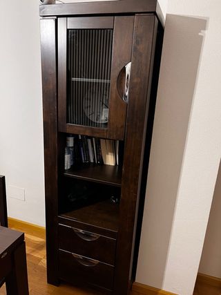 Mueble de salón de madera oscura, ideal para almacenar y exhibir objetos. - Diseño clásico con puertas de cristal. - Cajones y compartimentos de almacenamiento. - Acabado en madera de cerezo. Tiene que venir a recogerlo y desmontarlo, a Zamora