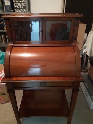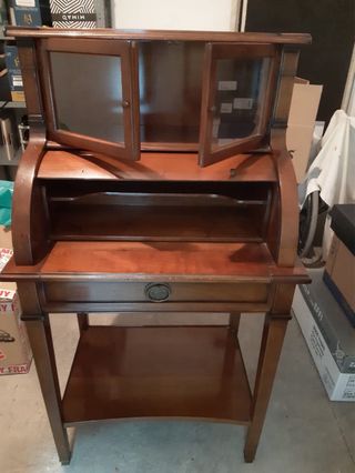 Bonita vitrina de madera oscura para salón. Ideal para organizar y exponer tus objetos. - Dispone de estantes y un armario con puerta de cristal. - Tres cajones en la parte inferior para guardar cosas. - Estructura robusta y en buen estado. Otros muebles a conjunto.